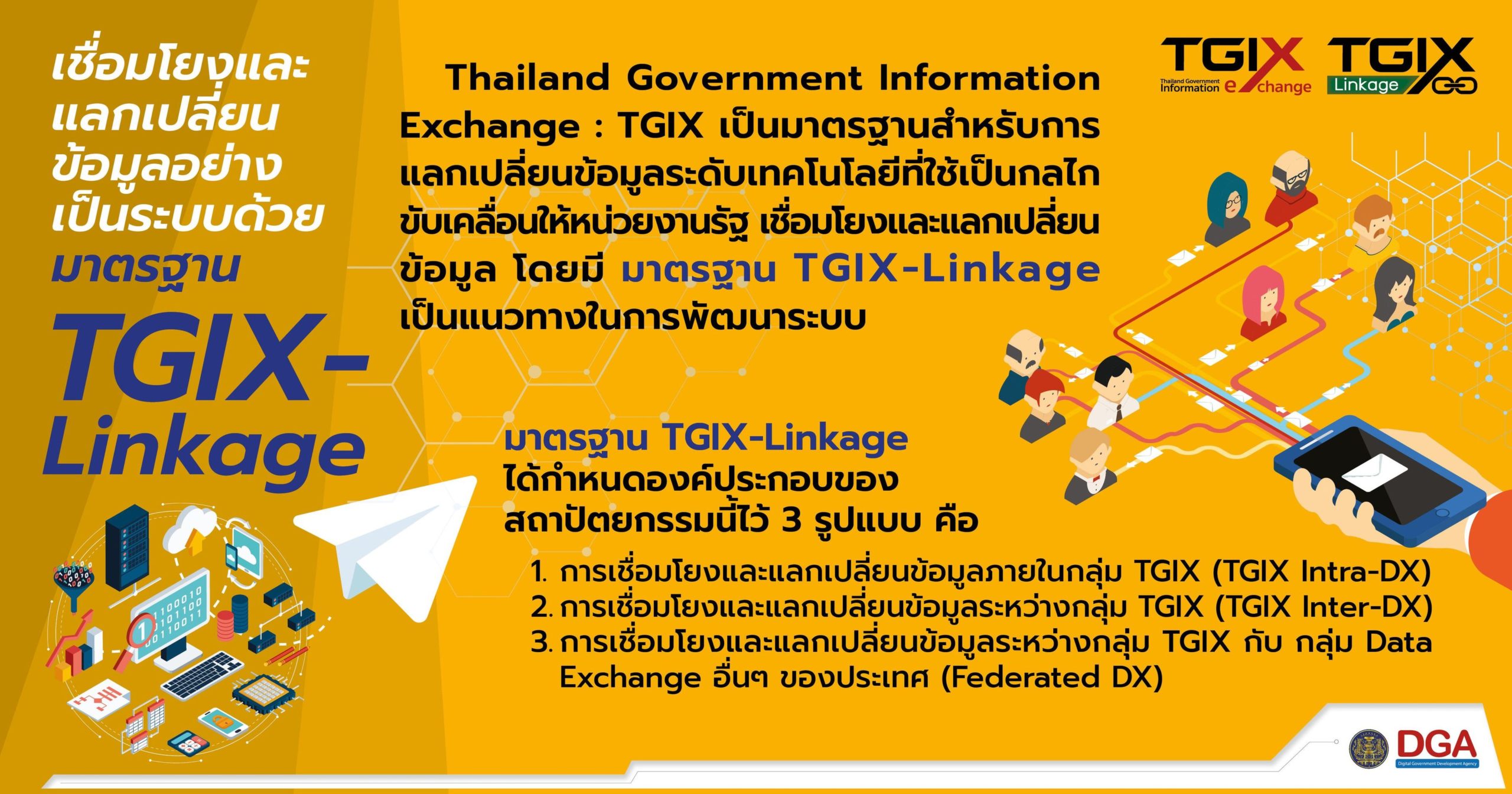 สำนักงานพัฒนารัฐบาลดิจิทัล (องค์การมหาชน) หรือ สพร. หรือ DGA จึงได้จัดทำมาตรฐานการเชื่อมโยงและแลกเปลี่ยนข้อมูลภาครัฐ (Thailand Government Information Exchange: TGIX) ขึ้นมา โดยขับเคลื่อนภายใต้แบรนด์ “มาตรฐาน TGIX-Linkage” เพื่อจะนำไปสู่การบูรณาการข้อมูล และการใช้ข้อมูลเพื่อขับเคลื่อนประเทศอย่างมีประสิทธิภาพ โดย DGA ได้จัดทำมาตรฐานว่าด้วยเรื่องของสถาปัตยกรรมการเชื่อมโยงและแลกเปลี่ยนข้อมูลภาครัฐ รวมถึงกำหนดองค์ประกอบของสถาปัตยกรรมนี้ไว้อย่างชัดเจน เพื่อให้หน่วยงานภาครัฐต่างๆ ได้ยึดถือเป็นแนวทางในการพัฒนาระบบต่อไป และ DGA ได้ดำเนินการปรับเปลี่ยนระบบศูนย์กลางแลกเปลี่ยนข้อมูลภาครัฐ (Government Data Exchange Center: GDX) เดิมให้เป็นผู้ให้บริการระบบสารสนเทศการเชื่อมโยงและแลกเปลี่ยนข้อมูลกลางที่มีมาตรฐานตาม TGIX
