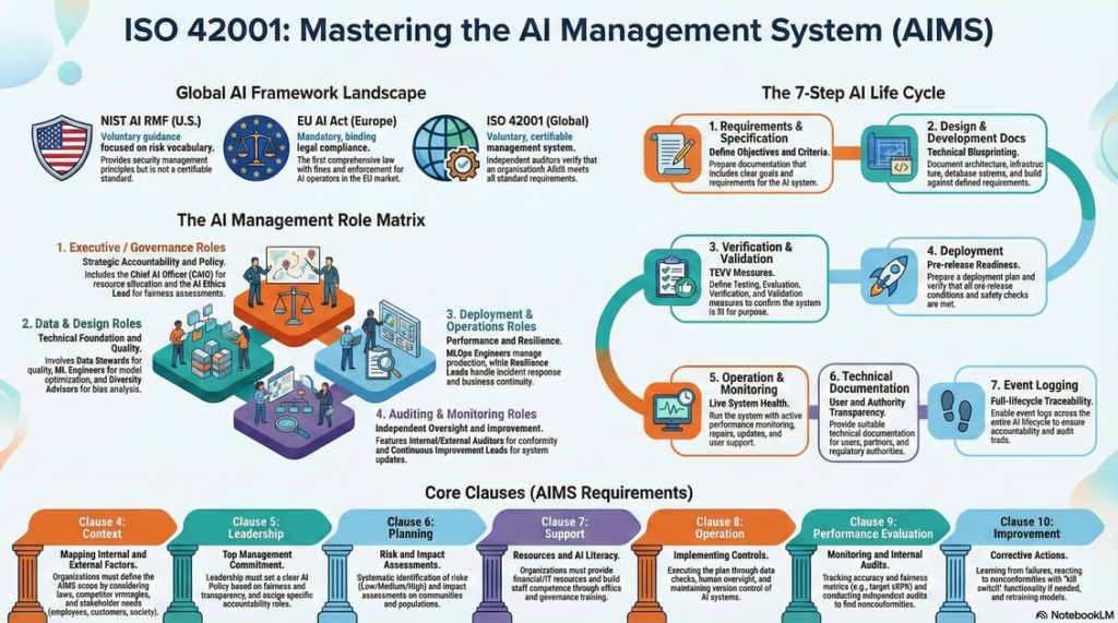 ความท้าทายนี้ทำให้เกิดมาตรฐานและกฎระเบียบขึ้นมากมายทั่วโลก จนองค์กรส่วนใหญ่อาจรู้สึกสับสนว่าจะยึดหลักเกณฑ์ไหนดี ตัวอย่างเช่น ในสหรัฐอเมริกามี NIST AI RMF ซึ่งเป็นเหมือน “คู่มือแนะนำ” ที่ดีเยี่ยมในการจัดการความเสี่ยง แต่ก็เป็นเพียงความสมัครใจ ไม่มีใครมารับรองผลให้ ในขณะที่ฝั่งยุโรปมี EU AI Act ซึ่งเป็น “กฎหมายบังคับ” ที่เข้มงวดและมีบทลงโทษรุนแรงหากฝ่าฝืน
